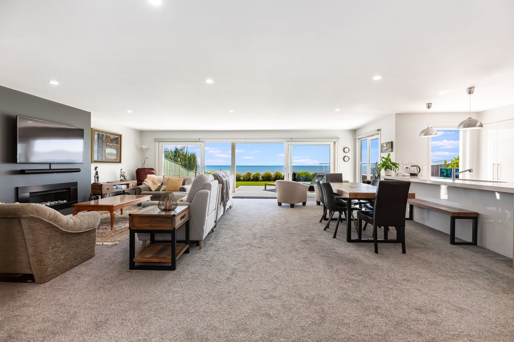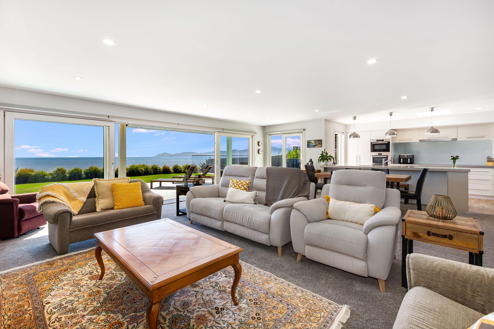 These spaces connect seamlessly to the expansive open-plan living and dining area, complemented by a sleek modern kitchen. Floor-to-ceiling sliders extend the living outdoors, perfectly framing the panoramic coastal outlook.